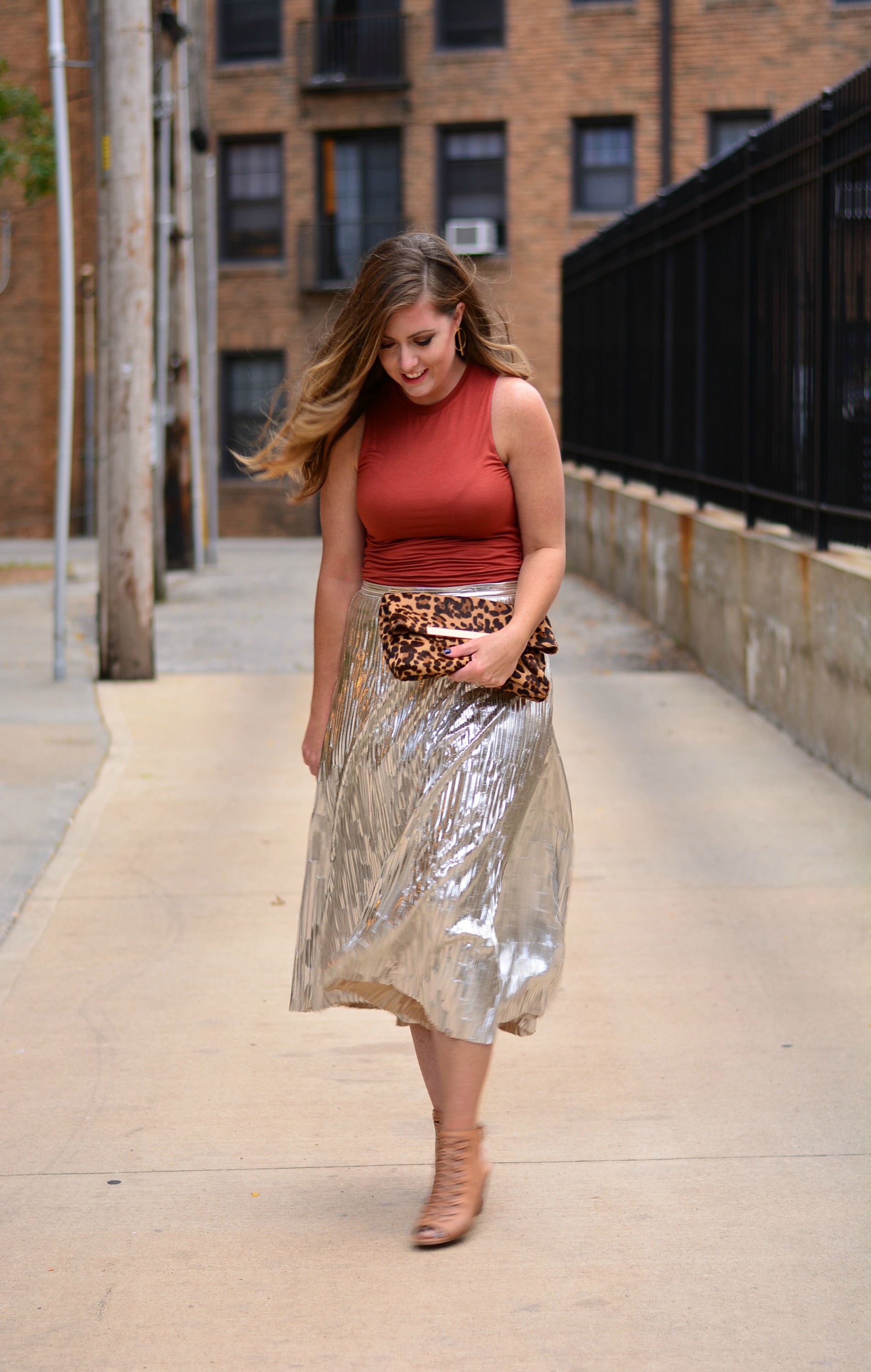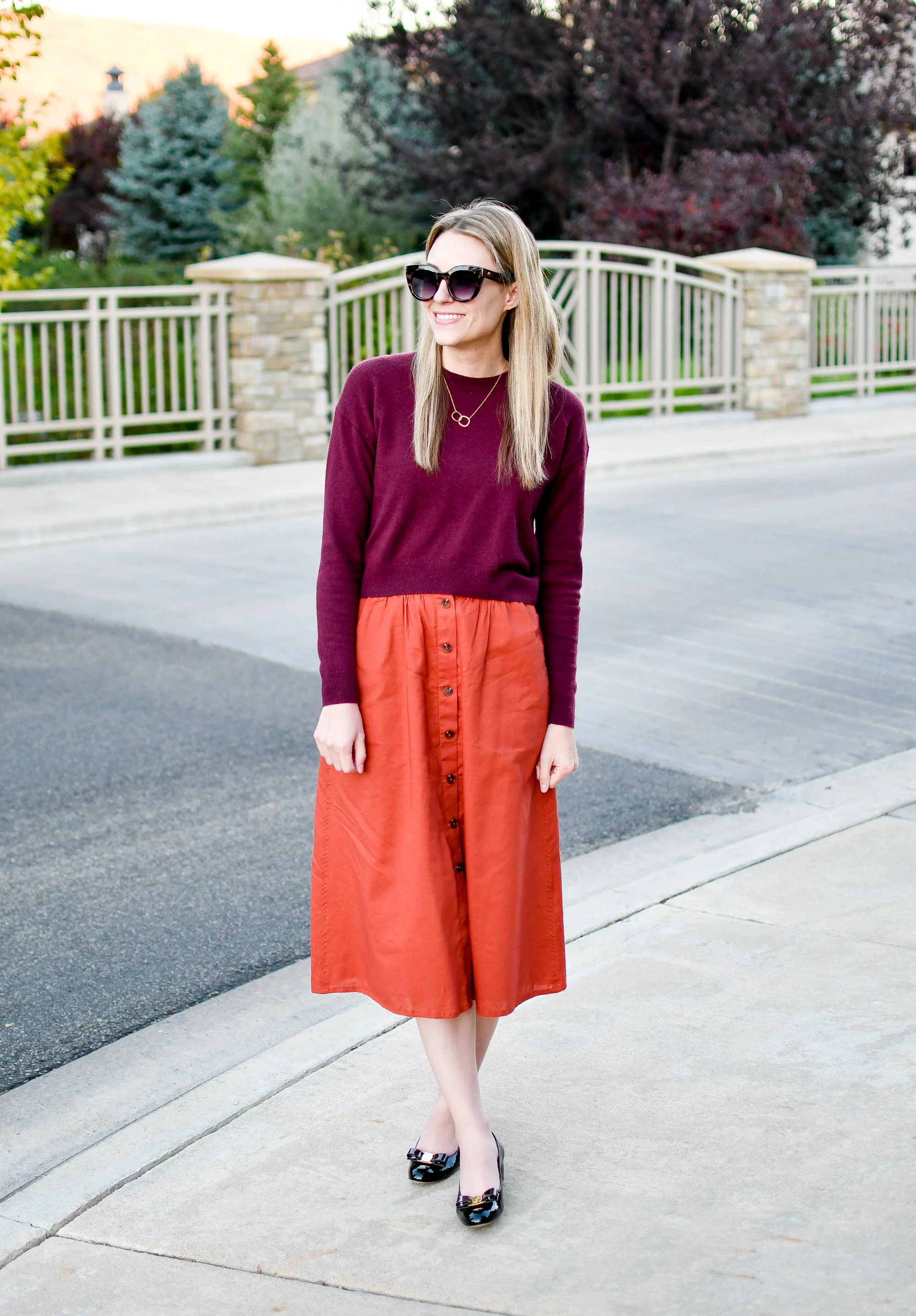 Rust midi best sale skirt outfit