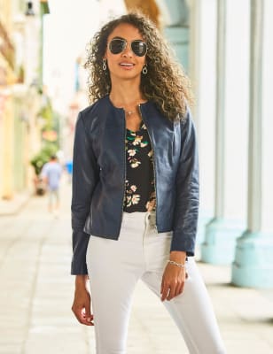 Collarless black best sale leather jacket